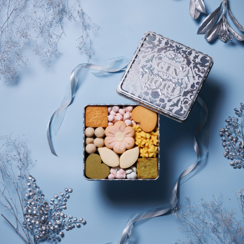 ヤマモモのほのかなピンクが愛らしい花形クッキーを主役に、ハート型のキャラメルサンドと抹茶のキャラメルサンド、サフランやクロモジなど森の恵みが香る焼き菓子を、仕切りなくぎっしりと敷き詰めました。