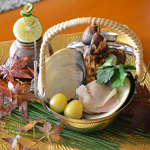 ・吸物/名物 蛤の吸物 土瓶蒸し仕立て(松茸 銀杏 結び三つ葉 酢橘)