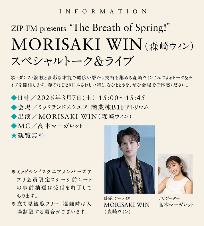 海を渡り、いくつもの困難や経験を積み、生命力を宿してきた人。だからこそ、優しさと強さを併せ持ち、人々に明るいエネルギーを放ちます。そんな春の息吹となるミッドランドスクエアでのスペシャルライブ。昨年10月には、ラブソングをテーマにしたEP作品「LOVE SONGS」もリリース。CMソングになった「Twinkle Twinkle Little Star」など普遍の名曲も多数。あの澄んだ歌声を聴ける日が待ち遠しいです。