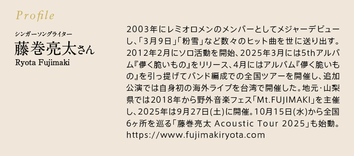 ソロになってからアルピニストの野口健さんやソマリアで活動する國井修医師、手練れのミュージシャンなど、多彩な人脈に恵まれます。「世界の僻地など、僕の知らなかった世界を知り、視界が広がる体験をしました。今まで、同じ時を生きる誰かとの繋がりを歌にしてきたけれど、ふと…横の時間軸だけじゃなかったんだと、思い至ったんです。例えば、父の父や母の母から…脈々と繋がれた命があって、今僕は生かされている。そんな縦の時間軸にも想像を膨らませるようになったんです」。また、「レミオ時代という過去と比較し、見えない未来を不安がり。そんな風に未来や過去ばかりに心を向ける日々が続いた時、地元の禅寺で『日日是好日』(2016年同名楽曲を発表)という禅語と出会い『今という時間を大事に生きたい』そう、心境の変化も訪れました」。引き寄せた珠玉の出会いが音楽制作をより豊かに。「一つの転機でした」。藤巻さんは今春、アルバム「儚く脆いもの」をリリース。聴くものの背中を押す歌声が流れます。